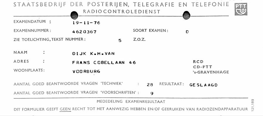 19 november 1976 was het zover en heb ik samen met mijn vader examen gedaan voor de D licentie in de Jaarbeurshallen in Utrecht. Met ca. 800 man, in een enorme hal, 10 vragen voorschriften en 30 vragen techniek beantwoorden. Zie de pdf met de examenvragen vragen 🙂 Een makkie en mijn vader had slechts 3 fouten totaal. Bij mij was het resultaat ook goed en op 15 januari 1977 hadden we de bevoegdheid om als PD0CJG en PD0CJH in de ether te komen op de 6 toegewezen kanalen met een door de RCD goedgekeurd apparaat. Zie de pdf met de brief van de RCD hierover.