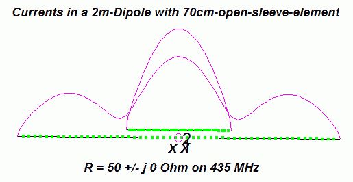 “An interesting phenomenon is the 3/2-lambda resonance of 2-m-elements on the 70-cm-band. A dipole for 2m has a very interesting azimuth pattern on 70cm. Now we add the 70-cm-open-sleeve-element to the 2-m-dipole. The currents change and we have the highest current in the parasitic fed open-sleeve element. With the correct distance we get one feedpoint for two bands, on 70 cm with 50 +/- j 0 Ohm. We can use this open-sleeve-construction as the radiating system in a Yagi for two bands.”