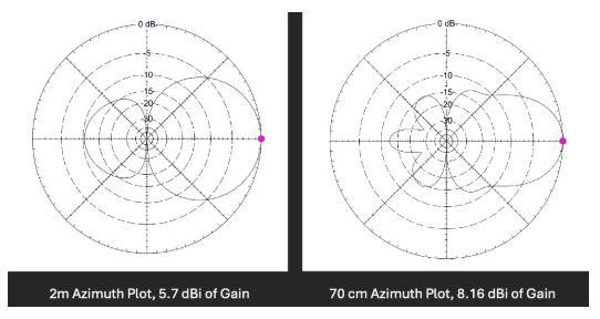 The antenna consists of two elements for the 2m band, with the front element acting as the driven element (radiator), to which the coax is connected. A five-turn choke is used to prevent common-mode currents on the feed line. The claimed gain is 4.1 dBd for the 2m band and 6.2 dBd for the 70 cm band.