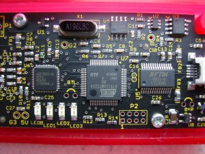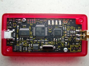 De DVAP Dongle bevat 3 (hoofd) componenten. Een ARM processor (AT91SAM) een USB<>RS232 chip (FT232) en een narrow band transceiver (ADF7021). O ja en nog een boel ander smd grut natuurlijk. De Dongle wordt geleverd met een SMA antennetje en knietje.