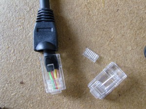 Kabel zo gevonden, XLR connector ook en een RJ45 met kapje erbij had de reguliere winkel ook op voorraad. Maar toen…. Ik kreeg met geen mogelijkheid de aders van de kabel in de RJ45 connector geschoven. Draad net te dik en te slap. Na een uur proberen nog geen resultaat en als je de aders gaat strippen krijg je sluiting en is er te weinig krimpkracht. Kortom, het gaat niet lukken. Dan toch maar een kabel in de Heil shop van Ger PA3AER aanschaffen.