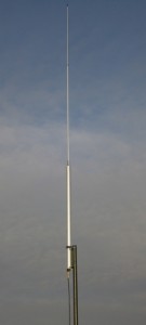 In het verleden heb ik een aantal professionele Procom antennes gehad. Dipolen en GP-ees en daarvan is nog wat hardware beschikbaar. Dus even aan de meetlat en met de zaag een glasfiberdipool voor 70.250 Mhz gebouwd (ik vrees dat hij iets te kort geworden is trouwens). De dipool vervolgens aan een paal schroeven, kabel eraan en op een voet plaatsen op het dakterras. (Wat is zo’n terras to handig he!)