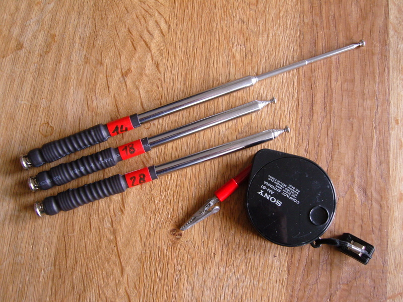 De Sony AN-61 gebruik ik als radiaal (tegencapaciteit) die ik met de krokodillenklem vastmaak aan de speciale soldeerlip bij de coaxconnector. (je ziet hem op de eerste foto net onder de HUK dongle). De telescoopantennes zijn 1,16 meter lang en natuurlijk niet optimaal, maar als je op een goede plek staat bijvoorbeeld op het strand of bovenop een berg dan zul je zien dat het prima werkt. IT GIVES THE RIGHT TRILL!